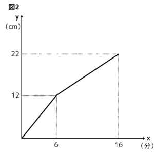 【問題】下の図1のように、直方体の水槽の中に直方体の鉄が置いてある。この水槽に毎分2ℓ(2ℓ=2000㎤)の割合で水を入れる。図2は、水を入れ始めてからx分後の、水槽の底から水面までの高さをy㎝として、xとyの関係を表したグラフである。次の問いに答えなさい