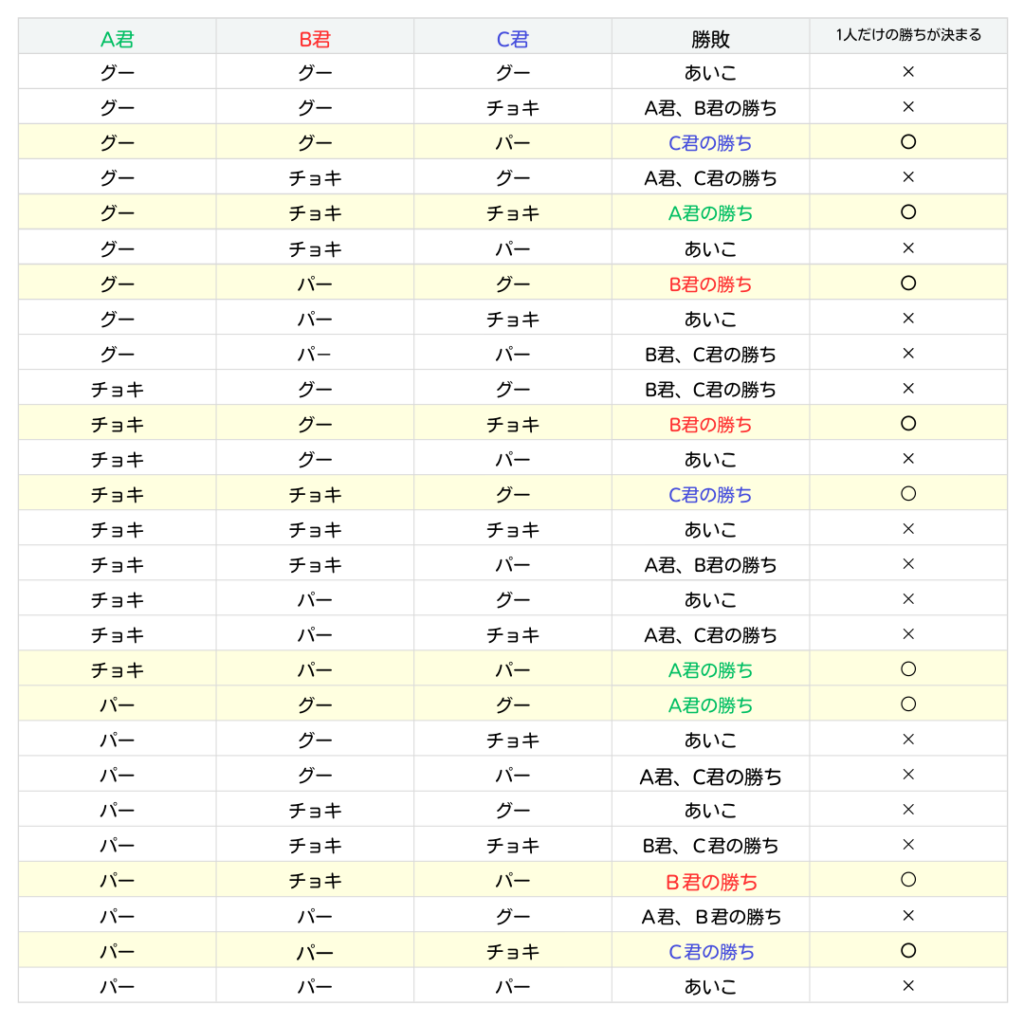 3人でじゃんけんをすると以下の27通りの組み合わせになるからね🙌
