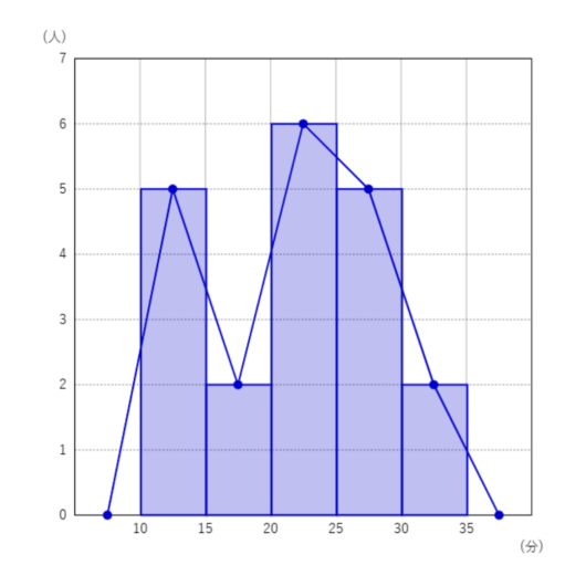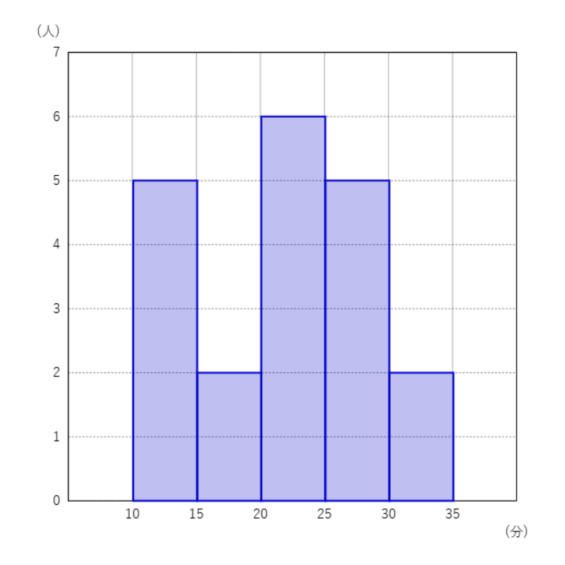 このヒストグラムはあるクラスの男子の学校から家までの通学時間です。