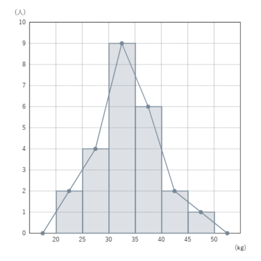 下の図は、あるクラスの男子の握力テストの結果をヒストグラムに表したものである。