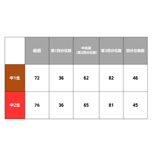中2生は中央値が65点なので65点以上の生徒が確実に7人はいます。