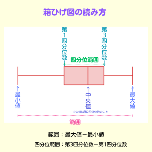 だから、箱ひげ図の縦線はデータを4等分で、各線の間には同じ個数のデータがあります。