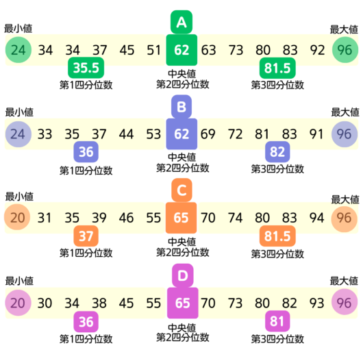 あとはそれぞれの箱ひげ図とあわせてみよう!